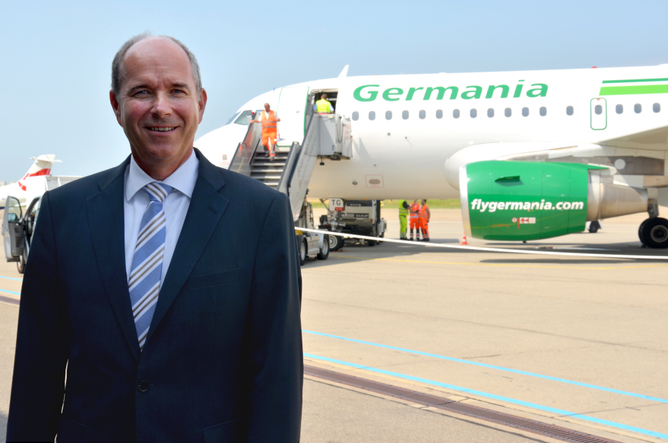 Claus-Dieter Wehr, CEO of Flughafen Friedrichshafen GmbH, standing in front of a Germania aircraft. The airline currently offers 23 departures per week from Friedrichshafen. Olbia (Sardinia) and Ibiza will be added as destinations in 2019. Germania will then offer 26 flights per week from the airport.
