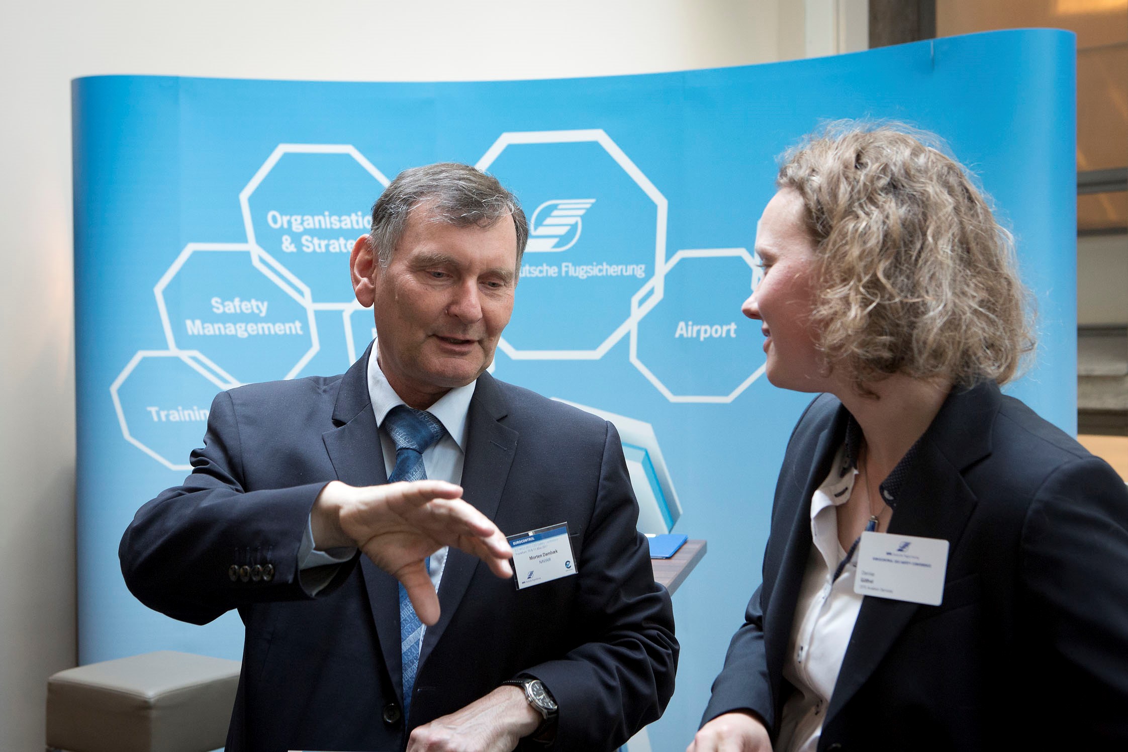 Der Stand bot Platz und Gelegenheit für fachlichen Austausch zu aktuellen Safety Themen. Hier zwischen Morten Dambæk (CEO, Naviair) und Denise Göthel Senior Expert Product Management, (DFS Aviation Services).