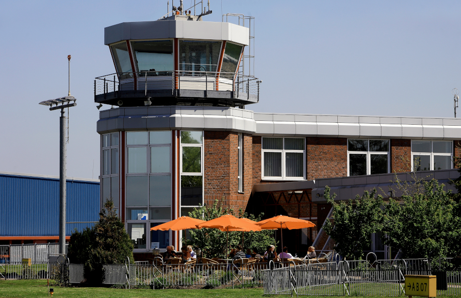 Der Kontrollturm am Flughafen Braunschweig Wolfsburg befindet sich direkt auf dem Dach des Hauptgebäudes.